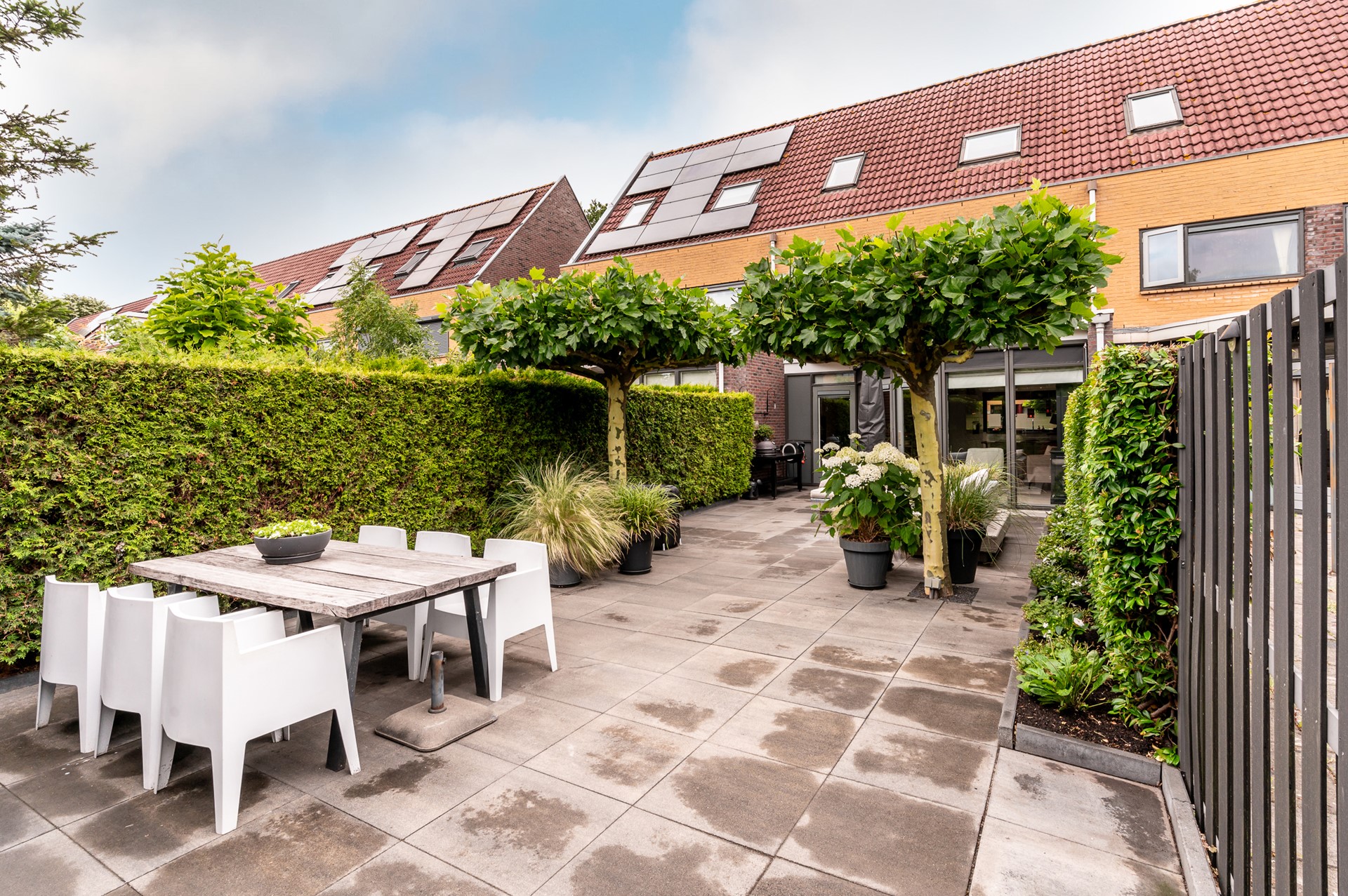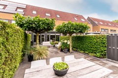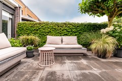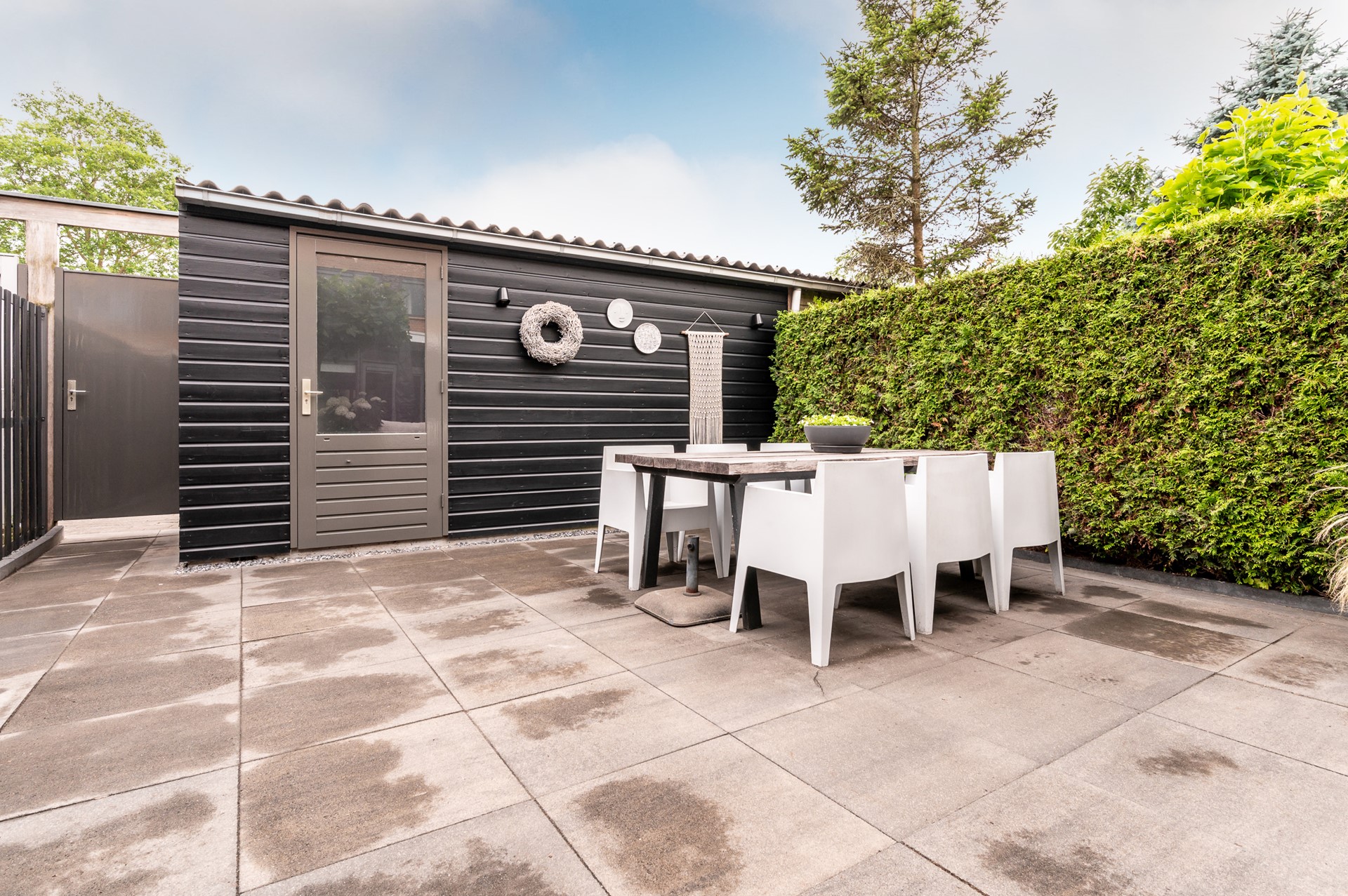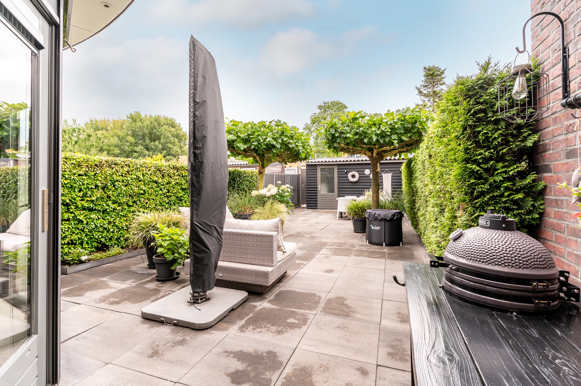 De achtertuin is keurig aangelegd met grote tegels en ligt ideaal op het zuidoosten. Hier kun je dus optimaal van de zon genieten. Er is zowel aan de voor- als achterzijde van de tuin stroom aanwezig, en aan de achterzijde is bovendien een wateraansluiting gerealiseerd ideaal voor de tuinliefhebber of een buitenkeuken. De tuin is voorzien van een houten berging met elektra en aan de woningzijde is een zonnescherm en screens geplaatst, wat zorgt voor comfort op warme dagen. Buitenleven voelt hier als vakantie.