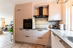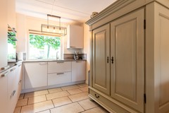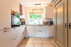 Aan de voorzijde ligt de volledig vernieuwde keuken in een L-opstelling. Deze is uitgerust met een grote oven, koelkast, vriezer, inductiekookplaat, vaatwasser en spoelbak. De afwerking is strak en modern, met veel werk- en opbergruimte. De gehele begane grond heeft een nette stenen vloer.