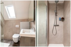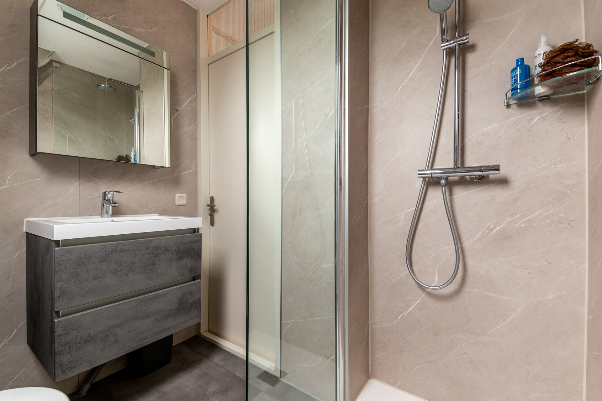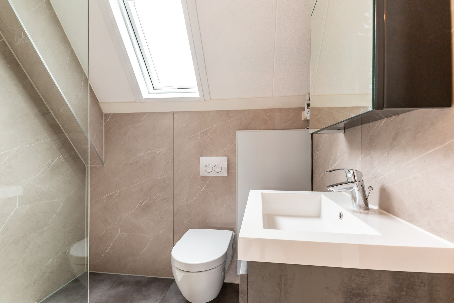 De badkamer is volledig vernieuwd en modern ingericht met een ruime inloopdouche, toilet en stijlvol wastafelmeubel.