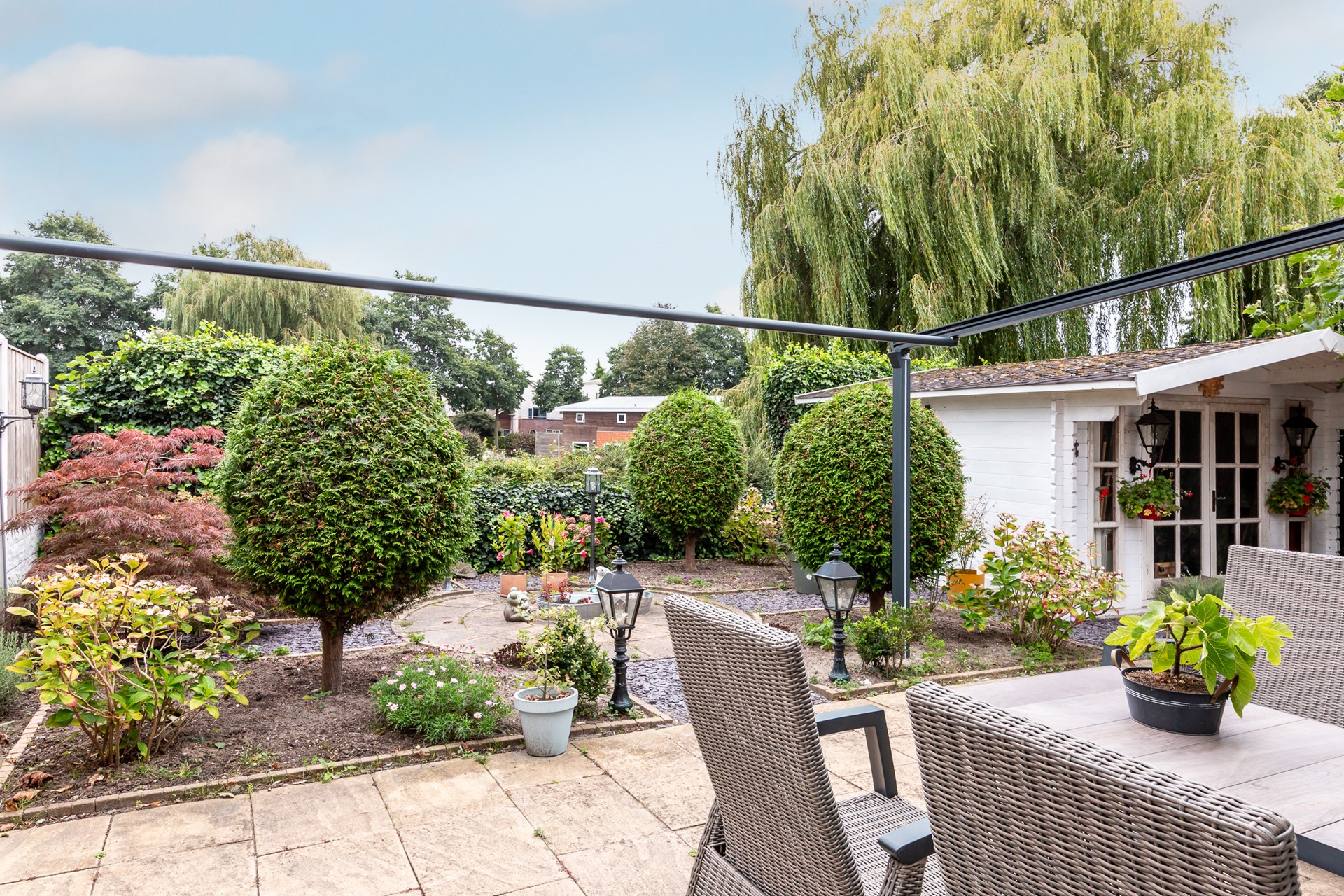 De achtertuin is echt een verlengstuk van de woonkamer: keurig aangelegd, op het zonnige zuiden en uitkijkend op een lekkere waterpartij. Dankzij de vrije ligging heb je geen directe inkijk en geniet je optimaal van rust, uitzicht en privacy. Achterin de tuin staat een ruime houten berging. De erfafscheidingen zijn degelijk uitgevoerd in houten panelen met betonnen panelen, lekker onderhoudsvrij en geeft een keurige tint aan het geheel.